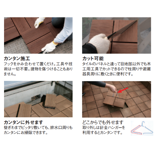 市松Iタイプ ナチュラルなウッドデザイン[材質]再生木材 再生プラスチック [サイズ]304×304×50 [重量]0.98kg 購入に関する注意事項 ・メーカー直送時は入数単位にて受注承ります。送料別途かかります。詳細はお問い合わせください。 特長 ・エスウッドパネルは置くだけでカンタンにデッキ空間を創りだせるすぐれものです。 ・フックを引っ掛けていくだけの簡単取付。 ・優れた施工性と高い加工性ですみずみまで美しく仕上がります。 ・ノコギリなどを使ってカット可能。室外機の回りや雨どい、排水口周りなどにもピッタリと敷き込むことができます。 ご注意 ・高層階や屋上など強風にさらされる可能性がある場所では、商品が風にあおられて転落する可能性があります。
