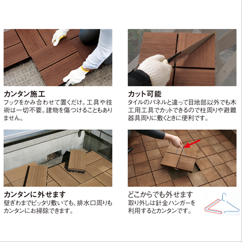 市松Eタイプ シンプルなストレートデザイン[材質]再生木材 再生プラスチック [サイズ]304×304×50 [重量]1.4kg 購入に関する注意事項 ・メーカー直送時は入数単位にて受注承ります。送料別途かかります。詳細はお問い合わせください。 特長 ・エスウッドパネルは置くだけでカンタンにデッキ空間を創りだせるすぐれものです。 ・フックを引っ掛けていくだけの簡単取付。 ・優れた施工性と高い加工性ですみずみまで美しく仕上がります。 ・ノコギリなどを使ってカット可能。室外機の回りや雨どい、排水口周りなどにもピッタリと敷き込むことができます。 ご注意 ・高層階や屋上など強風にさらされる可能性がある場所では、商品が風にあおられて転落する可能性があります。