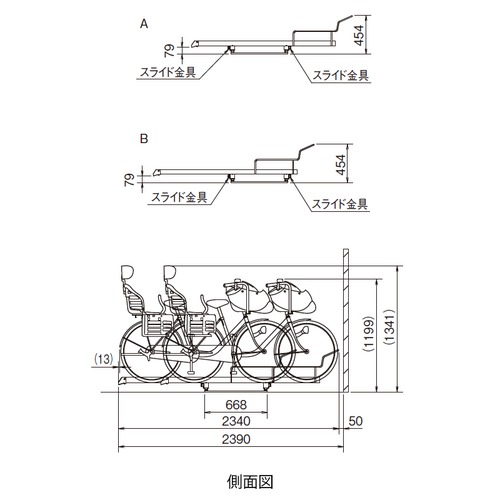 [サイズ]全幅1080mm、奥行2340mm、高さ454mm[付属品]スチールオールアンカーM8×70 [材質]ラック・レール:スチール [仕上]ラック:プラチナブラウン塗装 [収容台数]4 [ラックピッチ]270 [備考]連結型 購入に関する注意事項 運搬経費は別途お問い合わせください。 特長 ・3人乗り自転車(幼児2人同乗)、電動アシスト自転車に対応した高強度ラックです。 ・ラックピッチ270mmでハンドルやカゴの干渉を軽減しました。 ・レールは高耐食メッキ鋼板を使用しています。 ・スライドスペースは820mmです。 ご注意 ・20台毎に820mmのスライドスペースが必要になります。また、必ず20台毎に1セット基準型を設置してください。 ・20インチ以上の自転車で設定されています。 ・連結型は単独では使用できません。基準型の右側に連結してください。