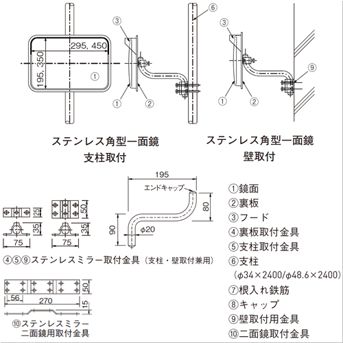 ・ガレージや駐車場の出入り、工場などの通路や階段、エレベーターの乗降口などの安全確認に最適なミラーです。・コンパクトで取付や角度調整なども容易です。 [品番/呼称]HSS-1929K [サイズ]195mm×295mm [重量]1.2kg [材質]鏡面:SUS304、裏板:SUS430、フード:SUS430 [仕上げ]研磨 ●仕様:角型一面鏡/壁面取付 購入に関する注意事項 代表画像です。 ご注意 ・支柱、壁取付以外にも電柱、天井取付仕様や工事現場の単管取付などにもオプションにて対応致します。 ・納期:ご確認ください。