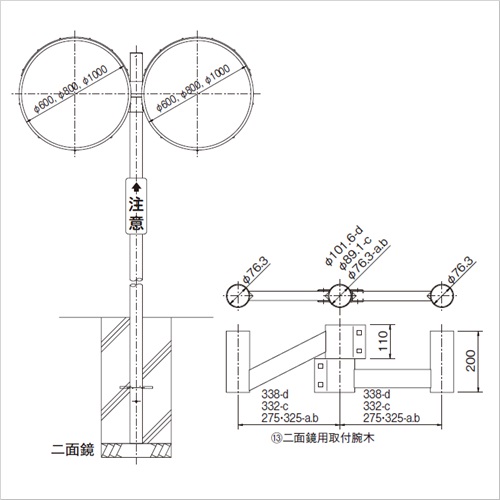 ・アクリルミラーは反射率、耐候性に優れたカーブミラーです。・明るく鮮明な映像で確かな安全をご提供します。 [品番/呼称]AKP-1000 [サイズ]Φ1000mm [重量]76.0kg [材質]鏡面:メタクリル樹脂、裏板:FRP、フード:ポリカーボネート、取付枠:アルミニウム [仕上げ]真空蒸着 ●仕様:丸型二面鏡/支柱 Φ101.6mm×4800mm 購入に関する注意事項 ご注意 ・支柱、壁取付以外にも電柱、天井取付仕様や工事現場の単管取付などにもオプションにて対応致します。 ・支柱は運搬、設置に便利なジョイント(分割)式のJポール(φ89.1用)もございます。お問い合わせください。 ・納期:ご確認ください。