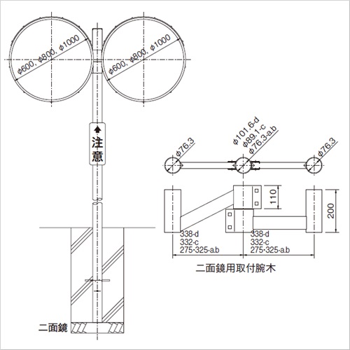 ・アクリーンは鏡面表面を特殊な超親水性コート液でコーティングすることにより防滴機能を実現し、防汚防曇効果を発揮します。 [品番/呼称]KP-600 [サイズ]Φ600mm [重量]35.0kg [材質]鏡面:メタクリル樹脂、裏板:FRP、フード:ポリカーボネート、取付枠:FRP [仕上げ]真空蒸着 ●仕様:丸形二面鏡/支柱Φ76.3mm×4000mm 購入に関する注意事項 ご注意 [ご注意] ・支柱、壁取付以外にも電柱、天井取付仕様や工事現場の単管取付などにもオプションにて対応致します。 ・支柱は運搬、設置に便利なジョイント(分割)式のJポール(φ89.1用)もございます。お問い合わせください。 ・納期:ご確認ください。