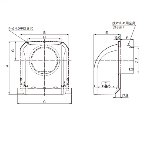 ・コンパクトでスッキリとしたデザインです。・新ガラリ構造と折曲げ付のサイドアップ水切板を採用したことで、排気や雨水による壁面の汚れを低減できます。 ・防虫網は着脱可能です。 [品番/呼称]FY-MFA 033 [サイズ]A192mm、B177mm、C195mm、D72mm、E96.5mm、F32mm、G69.3mm、H120mm [重量]230g [ご注意] ・材質:アルミニウム、仕上げ:耐食処理仕上げ(クリアコート)、ブラック塗装(-K) ・FD付・防虫網付機種はメンテナンスが出来る位置にて使用してください。 ・防虫網付は油煙を排気する台所等には目づまりする場合がありますので設置を避けてください。 ・FD付の機種は特定防火設備該当品です。 ・防火ダンパー:公称作動温度72℃(FY-MFAA、FY-MGAA)、120℃(FY-MFAB) ●仕様:ガラリ付 ●適用パイプ(呼び径):SU75 75mm×80mm ●有効換気面積:排気:42センチ平方メートル ●有効換気面積:給気:49センチ平方メートル 購入に関する注意事項