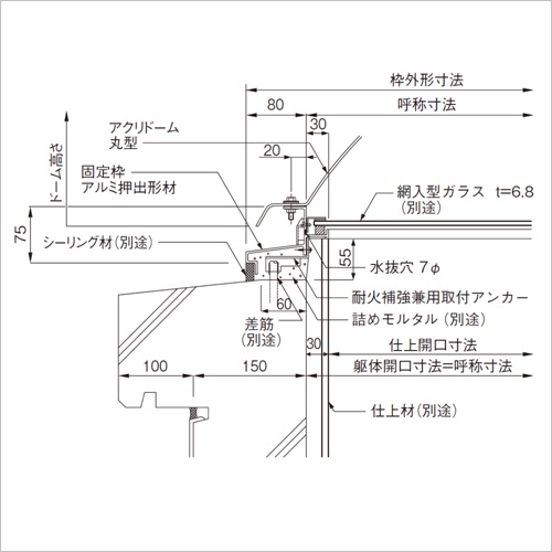 ・直線が多い建築空間に曲線の優しさを作る丸タイプのトップライトです。曲面で受けた光が室内に柔らかな光を投げかけ、半球を伏せた外観はひときわ印象的です。丸型のフォルムから設計の新しいバリエーションが広がります。(耐火補強) [色]ドーム色:アクリル樹脂、オーパル:乳白色、クリア:無色透明(受注生産)、ポリカーボネート樹脂乳白色(受注生産) [品番/呼称]M-90F [サイズ]ドーム呼称寸法:Φ900mm、枠外形寸法:Φ1060mm、ドーム高さ:280mm [材質]ドーム:アクリル樹脂(アクリドーム)ポリカーボネート樹脂(タフライトドーム)、枠:外枠 アルミ(仕上げ:アルマイト処理)耐火補強高耐食溶融めっき鋼板 [ご注意] ・アクリドームの材質はアクリル樹脂、色調はオーパル(乳白色)です。クリアは受注生産です。タフライトドーム(ポリカーボネート樹脂・乳白色)は受注生産です。 ・標準付属品:ドーム本体、取付金具、部品一式 ・二段水切、6.8mm網入り型ガラスは別途です。 ・運搬諸経費は別途お問い合わせください。 ・納期:受注生産となります。 購入に関する注意事項