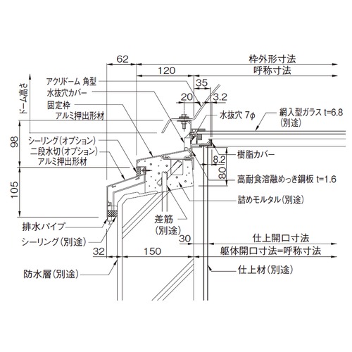[材質]・ドーム:ポリカーボネート樹脂 ・枠:外枠 アルミ(仕上げ:アルマイトクリア)、耐火補強、高耐食溶融めっき鋼板 ・ドーム色調:ポリカーボネート樹脂、乳白色(受注生産) [サイズ] ・ドーム呼称寸法:1300角 ・枠外形寸法:1540角 ・ドーム高さ:380 購入に関する注意事項 特長 オーソドックスな角タイプは、トップライトの基本形です。(固定型) どんな場所にも調和するシンプルさから、多彩な用途に採用されています。最近では、耐衝撃性にすぐれているということで、タフライトドームも数多くご使用いただいています。 ご注意 ・アクリドームの材質はアクリル樹脂、色調はオーパル(乳白色)です。クリアは受注生産です。タフライトドーム(ポリカーボネート樹脂・乳白色)は受注生産です。 ・K-160F型,200F型は受注生産品です。 ・K-160F型,200F型のアクリドームクリアとタフライトドーム仕様はできません。 ・標準付属品:ドーム本体、 取付金具、 部品一式 ・二段水切、6.8網入り型ガラスは別途です。 ・運搬諸経費は別途お問い合わせください。 ・納期:お問い合わせください。(160F型,200F型は受注生産となります)