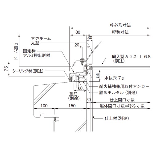[材質]・ドーム:ポリカーボネート樹脂 ・枠:外枠 アルミ(仕上げ:アルマイト処理)、耐火補強、高耐食溶融めっき鋼板 ・ドーム色調:ポリカーボネート樹脂、乳白色(受注生産) [サイズ] ・ドーム呼称寸法:φ600 ・枠外形寸法:φ760 ・ドーム高さ:190 購入に関する注意事項 特長 直線が多い建築空間に曲線の優しさを作る丸タイプのトップライトです。曲面で受けた光が室内に柔らかな光を投げかけ、半球を伏せた外観はひときわ印象的です。丸型のフォルムから設計の新しいバリエーションが広がります。(耐火補強) ご注意 ・アクリドームの材質はアクリル樹脂、色調はオーパル(乳白色)です。クリアは受注生産です。タフライトドーム(ポリカーボネート樹脂・乳白色)は受注生産です。 ・標準付属品:ドーム本体、取付金具、部品一式 ・二段水切、6.8mm網入り型ガラスは別途です。 ・運搬諸経費は別途お問い合わせください。 ・納期:受注生産となります。