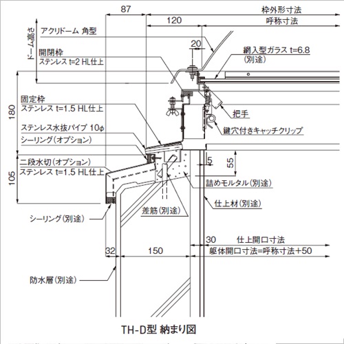 [色]ドーム色:アクリル樹脂、オーパル:乳白色、クリア:無色透明(受注生産)、ポリカーボネート樹脂乳白色(受注生産)[品番/呼称]TH-D-90型 [サイズ]ドーム呼称寸法:900角、枠外形寸法:1140角、ドーム高さ:280mm、ガラス寸法:908角 [材質]ドーム :アクリル樹脂(アクリドーム) ポリカーボネート樹脂(タフライトドーム)、天板:SUS304 +中空シート、枠:SUS304 ヘアーライン ●開放角度:70° 購入に関する注意事項 ・アクリドームの材質はアクリル樹脂、色調はオーパル(乳白色)です。クリアは受注生産です。タフライトドーム(ポリカーボネート樹脂・乳白色)は受注生産です。 ・運搬諸経費は別途お問い合わせください。 ・納期:お問い合わせください。 性能 ・通常はトップライト、点検時は出入り口として利用できるハッチです。内側からスムーズに開閉できます。ビル、公共施設、工場などの屋上点検口に最適です。 ●TH-D-60 気密性……A-4 水密性……W-5 耐風圧性…S-7 ●TH-D-90 気密性……A-4 水密性……W-5 耐風圧性…S-3 ご注意 ・この商品は必ずガラスが必要です。(ガラスを設置しないと急激な開き方をするので危険です。) ・標準付属部品:ドーム本体、ステンレス取付金具、部品一式 ・二段水切、6.8mm網入り型ガラスは別途です。