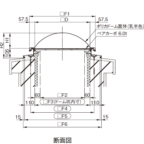 [色]乳半色[品番/呼称]DF9N [サイズ]900角 [重量]33.5kg [付属部品]半球形状ドーム、アンカー金物、ビス、網入り型板ガラス(6.8mm)、ポリカーボネート樹脂製複層板(6.0mm) [材質]ポリカーボネート ●仕様:断熱型 半球形状フレーム付 ●原板厚さ:3.0mm ●オプション部材:二段水切り(アルミ部材) 購入に関する注意事項 特長 ・屋内外を分離した断熱材使用の特殊フレーム構造で、外部からの熱伝導を大幅に低減します。 ご注意 ・重量には網入りガラスを含んでいます。 ・建告1399号第5の三の基準に適合していますので、30分耐火仕様としてお使いいただけます。