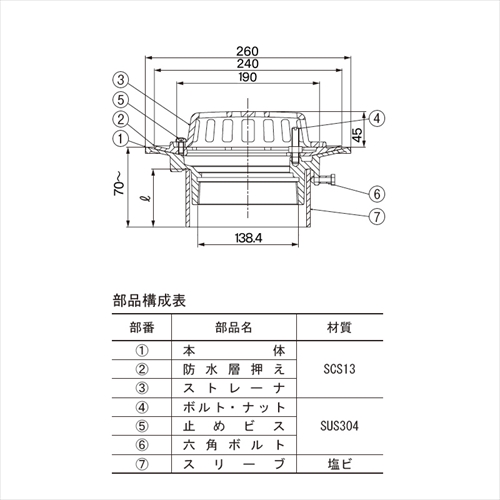 アスファルト・シート防水、ねじ込式です。 [サイズ]A:260mm、H:70~mm、B:240mm、C1:190mm、C2:143mm、h1:132.0mm、h2:45mm、h3:70mm、d:138.4mm [材質]SCS13 ●配水管種別:SGP ●部品構成表: (1)部品名:本体 材質:SCS13 (2)部品名:防水層押え 材質:SCS13 (3)部品名:ストレーナ 材質:SCS13 (3)部品名:ストレーナ 材質:SCS13 (4)部品名:ボルト・ナット 材質:SUS304 (5)部品名:止めビス 材質:SUS304 (6)部品名:六角ボルト 材質:SUS304 (7)部品名:スリーブ 材質:塩ビ 【ご注意】H寸法(スラブ厚)をご指示ください。差込式、モルタル・塗膜防水用、デッキプレート用、外断熱工法用も用意しています。 購入に関する注意事項