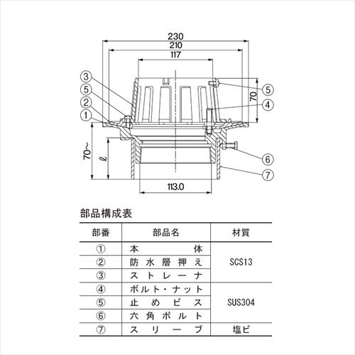 アスファルト・シート防水、ねじ込式です。 [サイズ]A:230mm、H:70~mm、B:210mm、C1:160mm、C2:117mm、h1:111.5mm、h2:40mm、h3:70mm、d:113.0mm [材質]SCS13 ●配水管種別:SGP ●部品構成表: (1)部品名:本体 材質:SCS13 (2)部品名:防水層押え 材質:SCS13 (3)部品名:ストレーナ 材質:SCS13 (3)部品名:ストレーナ 材質:SCS13 (4)部品名:ボルト・ナット 材質:SUS304 (5)部品名:止めビス 材質:SUS304 (6)部品名:六角ボルト 材質:SUS304 (7)部品名:スリーブ 材質:塩ビ 【ご注意】H寸法(スラブ厚)をご指示ください。差込式、モルタル・塗膜防水用、デッキプレート用、外断熱工法用も用意しています。 購入に関する注意事項