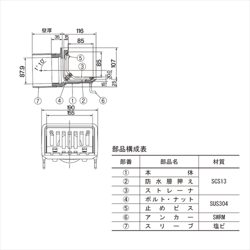 アスファルト・シート防水、ねじ込式です。 [サイズ]A1:107mm、A2:116mm、E:25mm、F:35mm、H:190mm、h:30.0mm、c:15mm、B:85mm、I:155mm、d:87.9mm [材質]SCS13 ●配水管種別:SGP ●部品構成表: (1)部品名:本体 材質:SCS13 (2)部品名:防水層押え 材質:SCS13 (3)部品名:ストレーナ 材質:SCS13 (3)部品名:ストレーナ 材質:SCS13 (4)部品名:ボルト・ナット 材質:SUS304 (5)部品名:止めビス 材質:SUS304 (6)部品名:アンカー 材質:SWRM (7)部品名:スリーブ 材質:塩ビ 【ご注意】壁厚寸法をご指示ください。モルタル・塗膜防水用、外断熱工法用も用意しています。 購入に関する注意事項