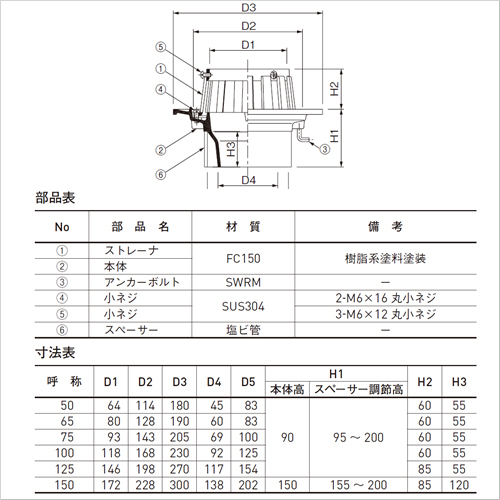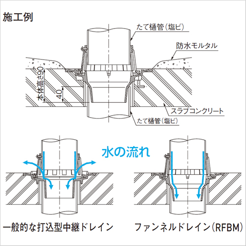 モルタル防水・塗膜防水用です。差込式です。 たて樋管は、硬質塩ビ管のVP・VU管のいずれも使用できます。 水はね、水吹出しの少ない快適なバルコニーを演出します。 デッキプレート用金具も別途用意できます。 ファンネルドレインについて 一般的な打込型中継ドレインは、構造上たて樋からの雨水がドレイン本体のフラットな面に当たるため、本体に当たった雨水の一部はストレーナの開口から飛び出します。独自のファンネル(ろうと)構造により、たて樋からの雨水はスムーズに流れます。ドレインの本体内で水の流れが改善されるため、通常の中継ストレーナ使用においても雨水の飛び出しは抑えられます。 [サイズ]表記による [本体重量]10.0kg [材質]FC150 [仕上]樹脂系塗装 【ご注意】スラブ厚H1 寸法をご指示ください。 購入に関する注意事項 備考 代表画像を表示しています。