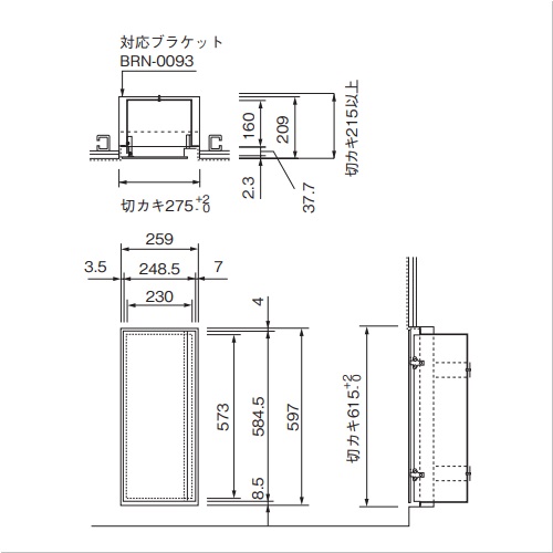 [材質]本体:スチール 扉:スチール[色]シルバーペイント [サイズ]256×204.3×594 [本体重量]9.6kg [備考] ・全埋込式 ・シルバー/レッドペイント扉付 ・文字入り 購入に関する注意事項 ・クロス貼り壁面専用の製品です。それ以外の壁面には取付けはできません。 ご注意 ・ブラケットは別売となります。BRN-0093 ・標準ステッカー併用を推奨致します ・消火器は含まれておりません。 ・運搬諸経費は別途お問い合わせください。