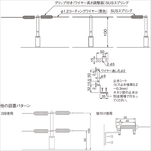 [仕様]ワイヤー:ブラック 端部:ステンレス[サイズ]5000(付属ワイヤー長) [材質]SUS304・真鍮(内部ケース) [備考]両端端フック付バネ付属(片側Uグリップ内蔵) SUS304(7×7) 黒色コーティングワイヤーφ1.2 [重量]43.8g 購入に関する注意事項 ・梱包送料は、お問い合わせください。 ・納期:ご確認ください。 特長 ・本体片側バネ内にはワイヤーを固定するUグリップ内蔵。ワイヤーの固定や長さ調整が簡単に行え、余剰なワイヤーをカットするだけの簡単施工です。 ・本体の取付けは、ワイヤー両端部のフックを支柱に引っ掛けるだけの簡単施工です。 ・本体ワイヤー(φ1.2、φ0.8)の支柱は共通です。 ・支柱は端部・中間部共通で、本体の2段使いが可能です。 ・取付ビス部の止水は別途現場で行ってください。 ・目視でワイヤーが水平に保たれていることが張りの目安です。両端部のバネは過度に引張り過ぎないように設置してください。 ご注意 ・スパンに応じて本体を組み合わせてください。 ・中間支柱は2000ピッチを目安としてください。 ・取付けは必ず構造物の際部に施工してください。 ・壁付けの場合は、支柱部を取外し、台座のみでご使用ください。